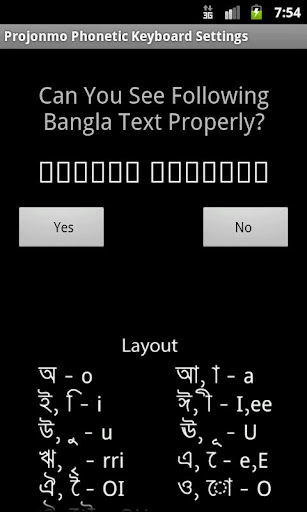 6. In Settings screen there is a Bangla sentence (বঙ্গের ঝালমুড়ি). If you can read it properly then press Yes button otherwise the No button.