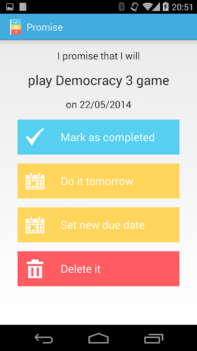 Promise is an To-do list like application but it focus on today tasks and plan for tomorrow. With Promise you will not miss something important in your life.