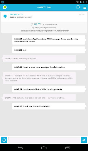 The Promptchat live chat Android mobile App supports both Promptchat's live chat accounts and Chat Center accounts. Features inculde, live website visitor traffic monitoring, proactive chat invites, receive notifications from web visitor live chat requests, use canned responses, chat categorization and departments.