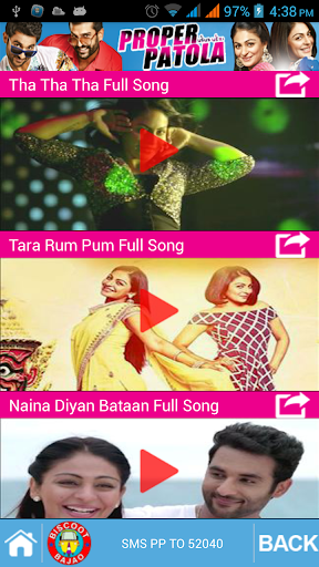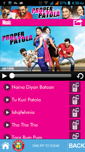 One stop shop and a complete power-packed App. The App is sleekly designed which represents the simplicity and panache associated with film. Experience the latest offering with Proper Patola App as this gives you access to music tracks and videos, unlimited photos, ringtones, behind the scenes, music and movie making videos, trailers, interviews, events and much more! All in one Proper Patola Pollywood movie App, your only destination. Proper Patola app consists of 4 major category of Image, Videos, Film, Music Songs available with Proper Patola App are as below: