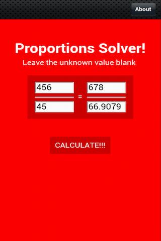 Proportion Solver is an easy way to solve proportions. Just leave the unknown value blank and within seconds an answer appears rounded to the nearest ten thousandth. But you don't have to even pay ten thousandth of a cent because this app is free!