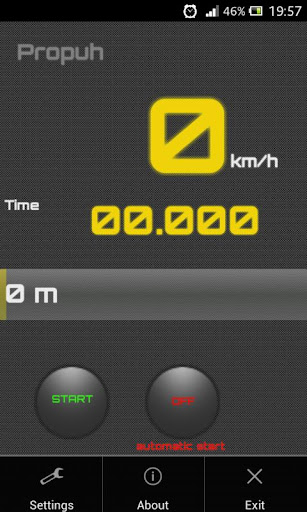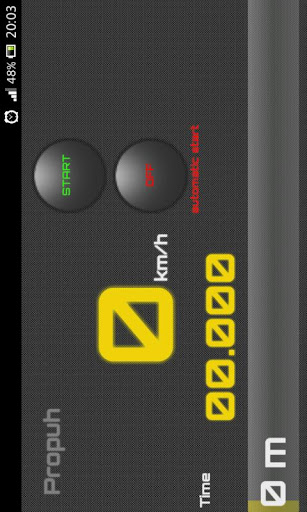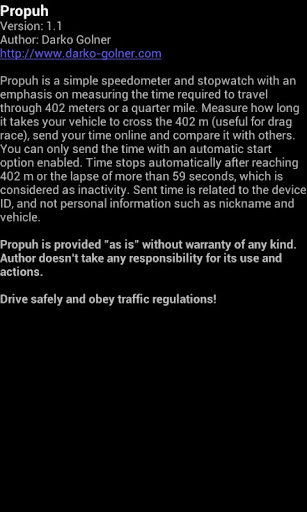 Propuh is a simple speedometer and stopwatch with an emphasis on measuring the time required to travel through 402 meters or a quarter mile. Measure how long it takes your vehicle to cross the 402 m (useful for drag race), send your time online and compare it with others. You can only send the time with an automatic start option enabled. Time stops automatically after reaching 402 m or the lapse of more than 59 seconds, which is considered as inactivity.