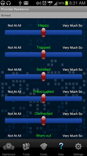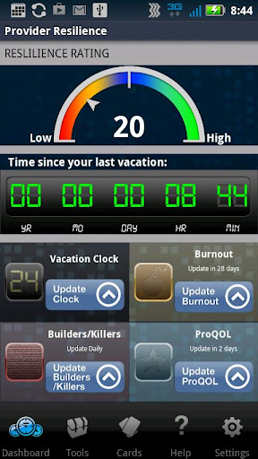 The Provider Resilience home screen gives a quick snapshot of the user’s overall resilience rating – generated through user self-assessments – and a reminder clock showing how long since the user last took a day off. Compassion fatigue, burnout, and secondary traumatic stress ratings can also be viewed in automatically generated graphs, allowing users to monitor their professional quality of life over time.