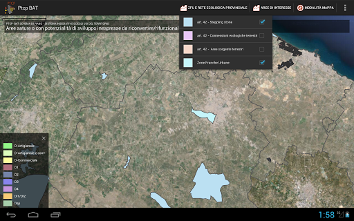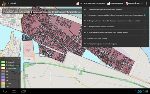 Nello specifico, l’App, attraverso una mappa della provincia BAT, consultabile in diverse modalità (terreno, stradale, satellitare, ecc.), consente la navigazione interattiva delle aree di interesse, suddivise per tipologia, consentendo il tocco su ciascuna area per visualizzarne sia il dettaglio particolare dell'area, che l’aggregazione dei dati di tutta la zona di tipo D relativa al comune di appartenenza, in modo tale da ricavarne immediatamente le informazioni di interesse.