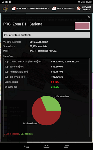 Questa App consente la consultazione dello stato dell’utilizzo e della disponibilità di aree per insediamenti produttivi previsti dalla pianificazione urbanistica comunale vigente (aree “D”) della Provincia di Barletta Andria Trani, secondo gli articoli 71, 72, 73, 74, 92, 95 e 97 delle NTA relative alla parte riguardante le aree oggetto di studio.
