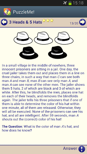 The puzzles and riddles are grouped into convenient categories, such as: basic, coins & matches, mathematics, logical, brain teasers, and jokes. And they are rated by stars from easy to extremely challenging.