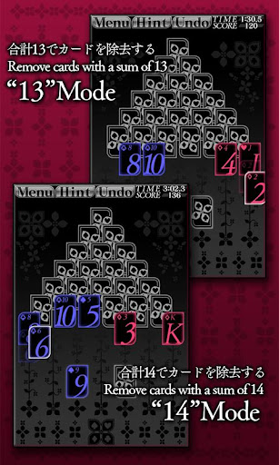 In "13-mode", cards with a sum of 13 are stacked and removed from the table. The 13 card (King, K) is removed from the table just by touching it.