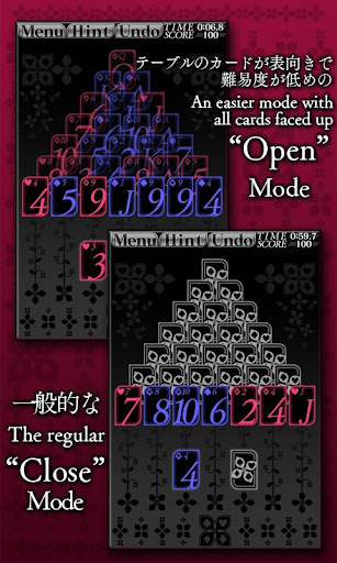 In "Close Mode", cards are places faced down, while in "Open mode", cards are places faced up. The first row has 1 card, second row has 2 cards and so on, till the seventh row with 7 cards.