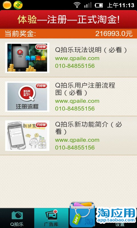 应用说明:Q拍乐是北京外智刊通讯科技有限公司研发推出的全新媒体平台,广告商可以在此平台发布自己的广告,用户通过手机客户端观看广告从而获得相应奖励,用户扫描广告二维码或在广告库中观看广告后会获得一次摇奖机会,开奖后若用户中奖Q拍乐则立即给用户发奖。