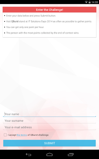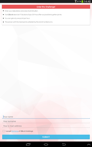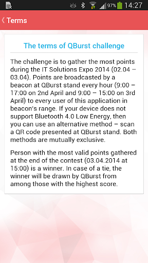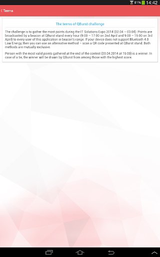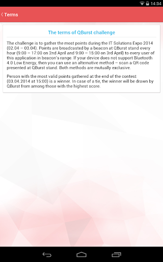 This application makes use of Bluetooth 4.0 LE to collect points that are broadcasted by QBurst's beacon at IT Solutions Expo 2014. Scanning QR code available at our stand is an alternative. The general idea is to gather points during the IT Solutions Expo 2014 and a person with the most points collected will win the contest. The application also gives users a chance to get discounts for some of our services.