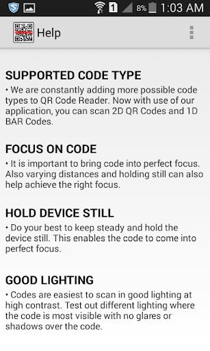 To scan a QR code or Barcode simply open the app, point the camera at the code. Simply select required action from convenient menu and follow the onscreen instructions. To scan QR code or Barcode using camera on your device, simply point your camera to code you wish to scan and app will automatically detect and scan it.