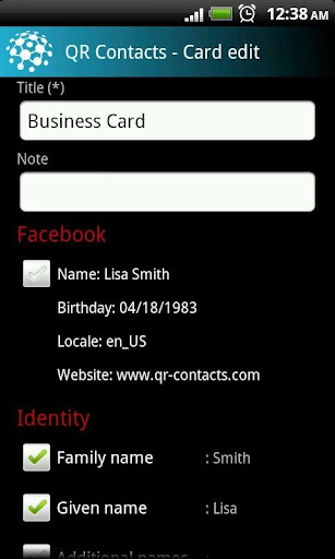 QR Contacts makes it easier and faster to connect with people on Facebook, to share your contact information, to manage virtual business cards, to exchange information, meeting locations... via QR Codes.