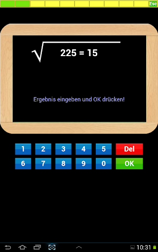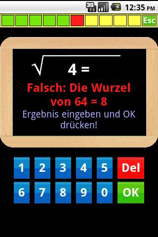 Als Übungsaufgaben können die Zahlenbereiche 10, 20 und 100 ausgewählt werden. Der Zahlenbereich bis 100 ist nur etwas für Mathe-Genies, wer kennt schon die Wurzel aus z.B. 8648! Pro Übungseinheit werden jeweils 10 Aufgaben gestellt, die einzelnen Zahlen werden von einem Zufallsgenerator ermittelt, das Ergebnis ist immer eine ganze Zahl. In der Fortschrittsleiste werden richtige Lösungen grün und Fehler rot markiert.