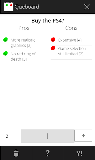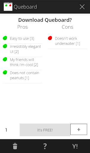 Queboard is an easy-to-use productivity tool that supports you in your decision-making process. Create questions, add weighted pros and cons, and make well thought out choices with Queboard!