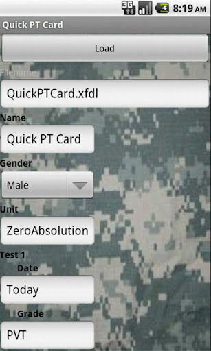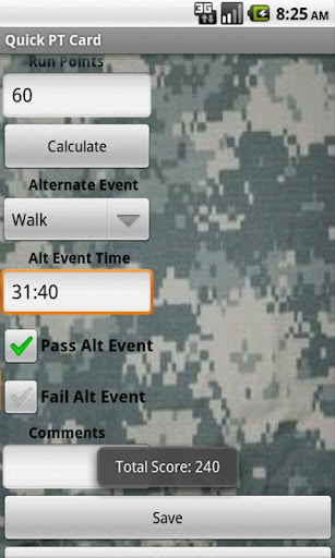 Quick PT Card allows you to enter some or all the information on a DA 705 (PT Card) in, calculate the score, and save or email the file in a DA705 to open with any XFDL Viewer. Alternate Events are calculated and added in if Passed.