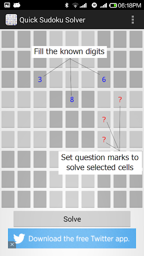Solve any 9X9 Sudoku whether easy, medium, hard or extreme.