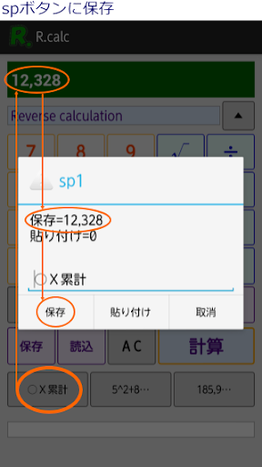 3個のsp1・sp2・sp3 ボタンに電卓の値を保存できます、また保存した値を必要な時に貼り付けることができます。
