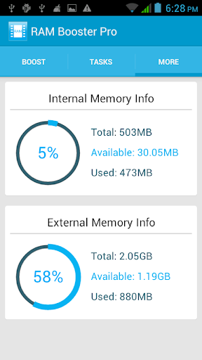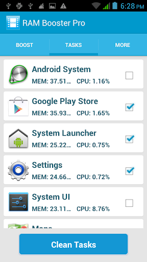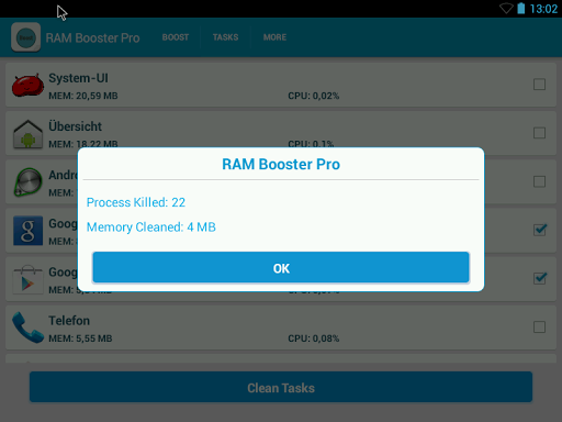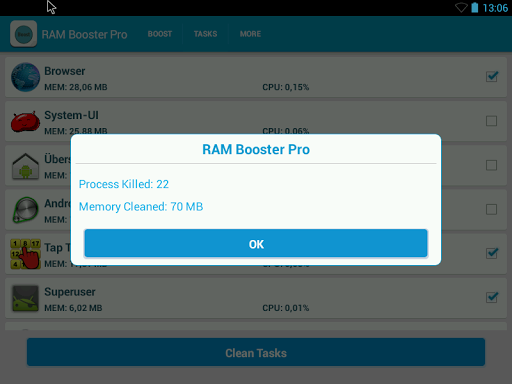 simply tap the Boost button to clean all unused applications from your system and clean up the used Memory.