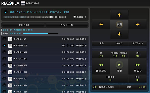 録画した番組を選んで、ブルーレイレコーダーに接続したテレビで視聴することができます。また、RECOPLAが自動で再生操作用のリモコンに切り替わり、再生・停止・チャプター送り・早見再生などの、ブルーレイレコーダーの操作することができます。