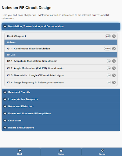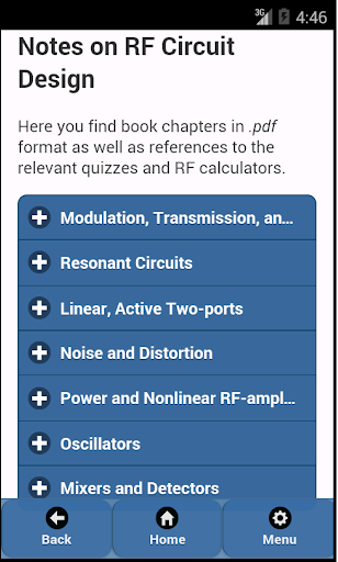 The App also contains short summaries on RF and microwave circuits as well as a free book on RF circuit design with the following chapters: