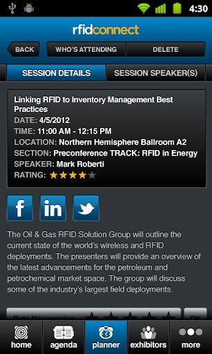 RFID Connect is the application for RFID Journal conferences. Easy to use and completely intuitive, the application includes the following: