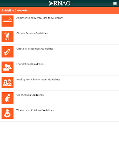 Topic areas for the guidelines include best practices for gerontology, primary health care, home health care, mental health care, emergency care and healthy work environments. This application includes content from more than 40 guidelines. The full PDF versions of the guidelines are available at http://www.rnao.ca.