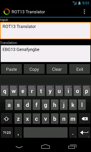 Plain and simple ROT13 encoder/decoder. Friendly copy/paste buttons. Useful e.g. to decrypt geocaching hints. No ads, requires no permissions.