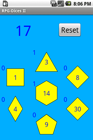 RPG-Dices II rolls d4, d6, d8, d10, d12, d20, d100 and counts up throws and results. You can also enable bonus dices and customise colours.