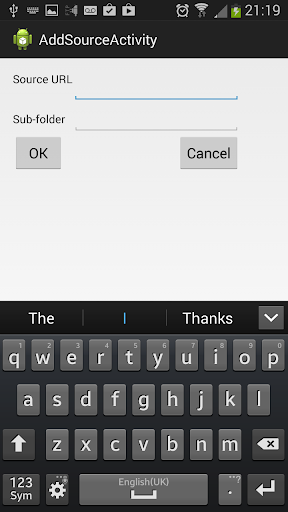 On the next screen, enter the URL for the feed, and give a folder name (this will be where the app stores the files it downloads - eg, if you enter "MyFolder", the directory will be sdcard/RSSMediaGrabber/MyFolder/)