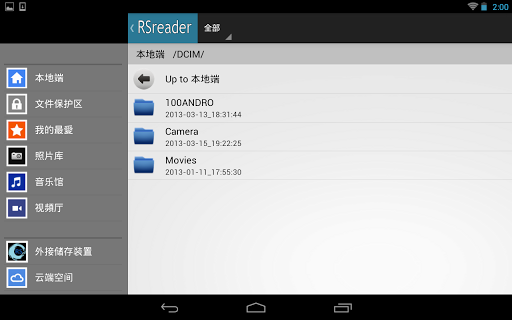 RSreader是一个支持Android行动装置的应用程序,您能够存取、播放与管理于Android装置上的本地端媒体档案,并利用无线WiFi的方式存取外接储存装置与云端服务器。透过RSreader,您可以方便地浏览或播放您的音频、视频、照片与文件档案并管理(复制、搬移、删除、更名、压缩、保护与分享)这些档案。于本地端,您拥有进阶的功能 - 我的最爱、文件保护区、照片库、音乐馆与视频厅来快速安全的存取档案。另外您也可以同时控制并分享外接储存装置给其他的Android行动装置的用户。
