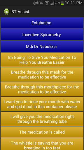 RT Assist is an application that was developed to help Respiratory Therapists better communicate with their Spanish-speaking patients and their families. Our focus is specific to translating the terms and phrases that Respiratory Therapists commonly use in the clinical setting. Included are phrases that can help explain standard procedures and reasons for specific therapies and/or medications. Patient assessment is possible through guided questions about mental status, pain levels and comfort. Intubated patients have a dedicated section that will allow clinicians to guide spontaneous breathing trials and assess extubation readiness. For simplicity, all questions have been designed to be given in a yes or no response.
