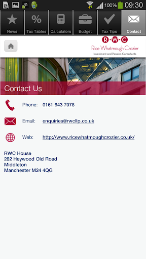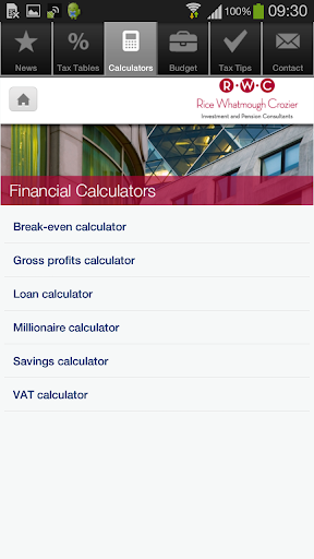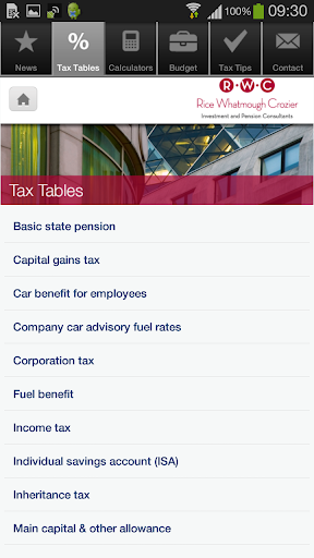RWC Tax Tools App provides you with UK tax rate data, tax and financial calculators, tax tips and daily financial news. Our FREE app is updated with all current rates and data and is available for you to navigate quickly and easily to get the information you need.