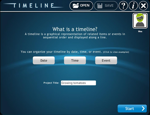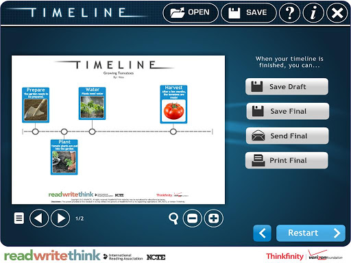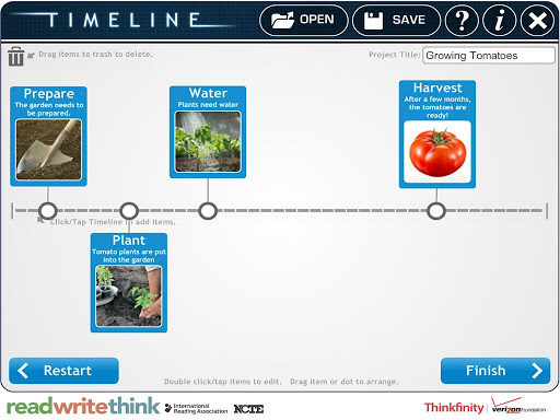 Timeline allows students to create a graphical representation of an event or process by displaying items sequentially along a line. Timelines can be organized by time of day, date, or event, and the tool allows users to create a label with short or long descriptive text. Adding an image for each label makes a timeline more visually appealing.