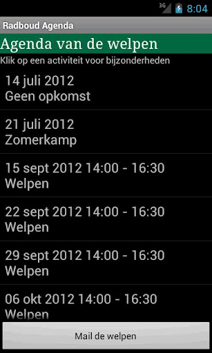 Deze applicatie laat je de agenda van de speltakken zien, zoals die op de site www.scouting-radboud.nl vermeld staat. De app vraagt de agenda op bij de site. Dat betekent dat je altijd de laatste informatie hebt.