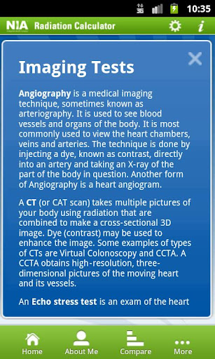 The Radiation Calculator was developed to help you learn about the many types of imaging studies that use radiation and also track the amount of your radiation exposure. Please Note: This app is NOT a substitute for medical advice. Talk with your doctor about the risks and benefits of any imaging study, whether there are any other alternatives, and if you have questions or concerns about your radiation exposure.