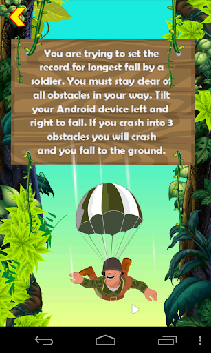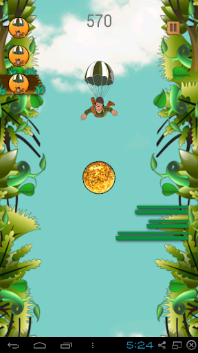 A fearless soldier survives a plane crash and drops to the jungle using a parachute. Your goal is to keep your soldier alive by letting him drop endlessly to the jungle avoiding obstacles that get in the way.