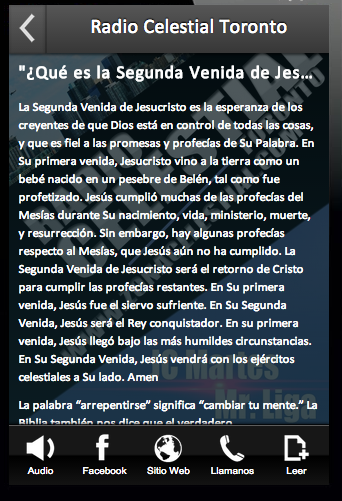 Sintoniza ahora Radio Celestial Toronto, una radio con la mejor música cristiana en todos los géneros, entra a www.zonacelestial.com para mas información y entretenimiento! Descarga la aplicación para la facilidad de escuchar la radio. Radio Celestial Toronto fue creada recientemente, y estamos preparando las programaciones y eventos para los oyentes! Dios te bendiga!