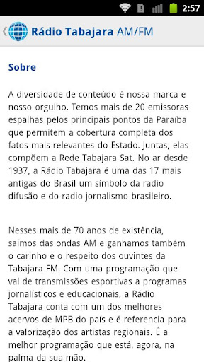 Nesses mais de 70 anos de existência, saímos das ondas AM e ganhamos também o carinho e o respeito dos ouvintes da Tabajara FM. Com uma programação que vai de transmissões esportivas a programas jornalísticos e educacionais, a Rádio Tabajara conta com um dos melhores acervos de MPB do país e é referencia para a valorização dos artistas regionais. É a melhor programação que está, agora, na palma da sua mão.