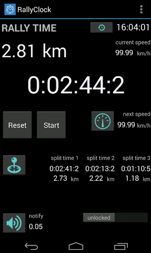 Rally Clock is a Regularity Timer used mainly for regularity rallying, oldtimer rallyes or TSD rallying (Time Speed Distance). Rally Clock is inspired by commonly available electronic tripmeters and rally computers and shows the theoretical distance travelled with a given average speed over a period