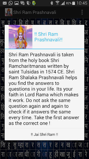 Shri Ram Shalaka Prashnavali is taken from the holy book Shri Ramcharitmanas written by saint Tulsidas in 1574 CE. Shri Ram Shalaka Prashnavali helps you find the answers to questions in your life. Its your faith in Lord Rama which makes it work.