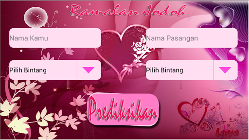 prediksi apakah anda dan pasangan anda berjodoh. cari tau potensi anda dengan si dia sampai pelaminan, apakah kecocokan anda baik baik saja atu kurang. dan bagaimanakah kedepannya jalinan kasih antara kalian berdua coba cari tau dengan prediksikan kecocokan nya dengan Ramalan Jodoh. aplikasi ini memiliki metode ramalan baru. dengan menggunakan nama dan rasi bintang sang pasangan. maka perhitungan yang dihasilkan diharapkan mendekati akurat berdasarkan karakter dan sifat masing masing