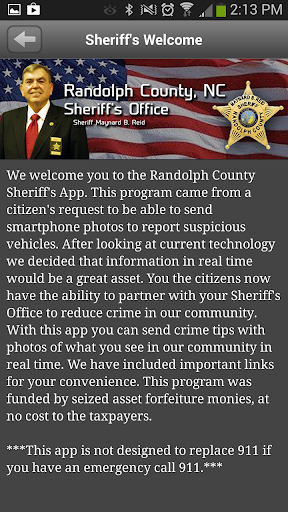 We welcome you to the Randolph County Sheriff's App. This program came from a citizen's request to be able to send smartphone photos to report suspicious vehicles. After looking at current technology we decided that information in real time would be a great asset. You the citizens now have the ability to partner with your Sheriff's Office to reduce crime in our community. With this app you can send crime tips with photos of what you see in our community in real time. We have included important links for your convenience. This program was funded by seized asset forfeiture monies, at no cost to the taxpayers.