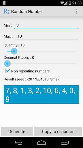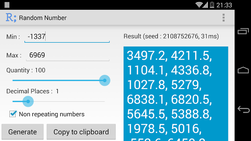 Random Number Generator for making decision of choosing things. This app generates random sets of non repeating numbers in configurable intervals. You can generate the number between -999999999999999 and 9999999999999999.