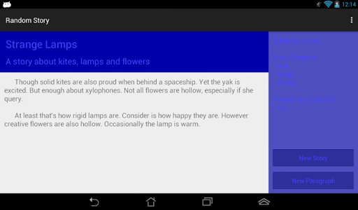 Have you ever been bored and wanted something to make you laugh? This app generates random stories from a set of sentences and words, which can either make no sense or be hilarious. You can also save the generated story if you find it memorable enough. Optimized for all types of devices and screen sizes, and supports Material Design on newer Android versions.