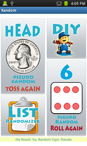 Depending on whether or not the device is connected to the internet, Random generates Pseudo random and Real Random (using Random.org) numbers. Users can simulate a die roll, a coin flip or use A DIY random number generator. A string randomizer option, which randomizes string input, is also available. Absolutely FREE, NO ADS