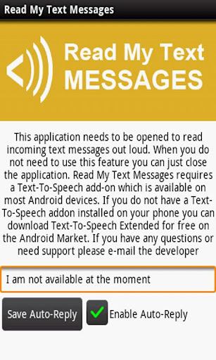 Reading text messages while driving is not only against the law, but it is also dangerous. With Read My Text Messages for Android, you can drive safely while having your text messages read out loud to you. You also have an option to set an auto-reply that sends out a custom text message to all incoming texts. To set the speech speed rate, just make the adjustments on your text-to-speech settings on your phone. This is a text to speech reader that you must have!