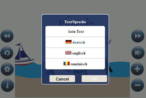 The story features English and the following languages: German, Italian, Romanian. The current language can be changed any time using the settings button (the wheel on the left side in the screenshots). More languages are planed to come out late 2014 (French, Spanish) as a free update. This is great for families living abroad or for bilingual families.