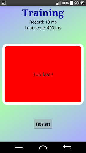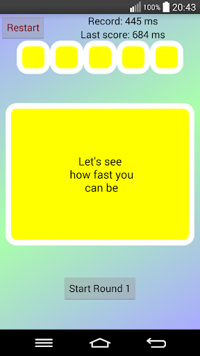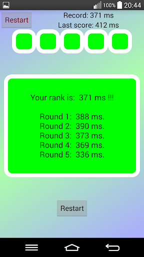 Play - Average time - This test returns the average result of five reaction times , Clicking before the right time will result in a 2 second penalty.