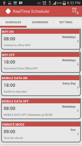 RealTime Scheduler can be a lifesaver for a number of reasons. For example you can easily configure RealTime Scheduler to automatically turn your Wi-Fi/Bluetooth,Mobile Data, on or off according to your desired schedule. The app can be very useful in situations when you always forget to switch off your Wi-Fi connection or you just want to save some battery for your device.