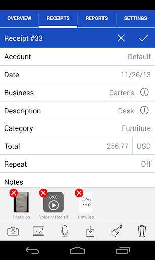Add new receipts quickly using the autofill feature. Capture photos, add drawings, record voice memos, and attach files from other apps. Receipt totals may be entered in any currency and are instantly converted to your home currency. Create sophisticated filters based on multiple receipt fields to quickly find your receipts.